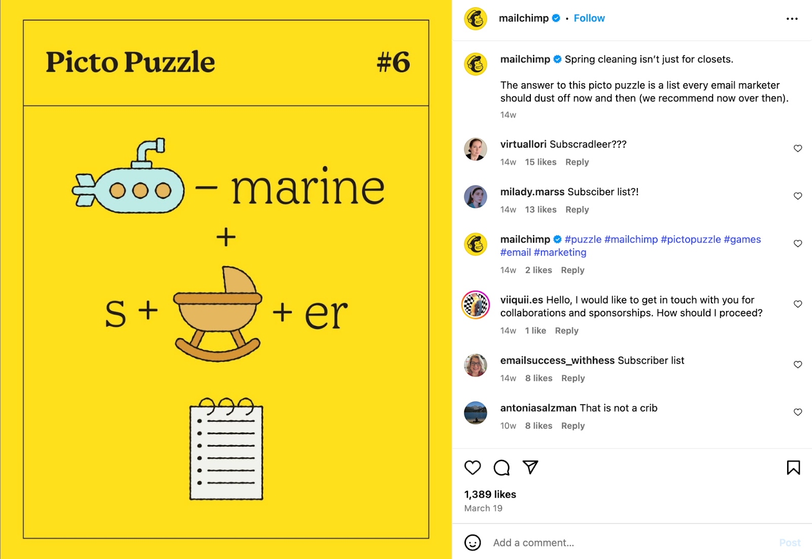Mailchimp’s Instagram posts are examples of their consistent designs. Their posts feature yellow, the brand color, prominently while fun messaging contributes to make their posts instantly recognizable.